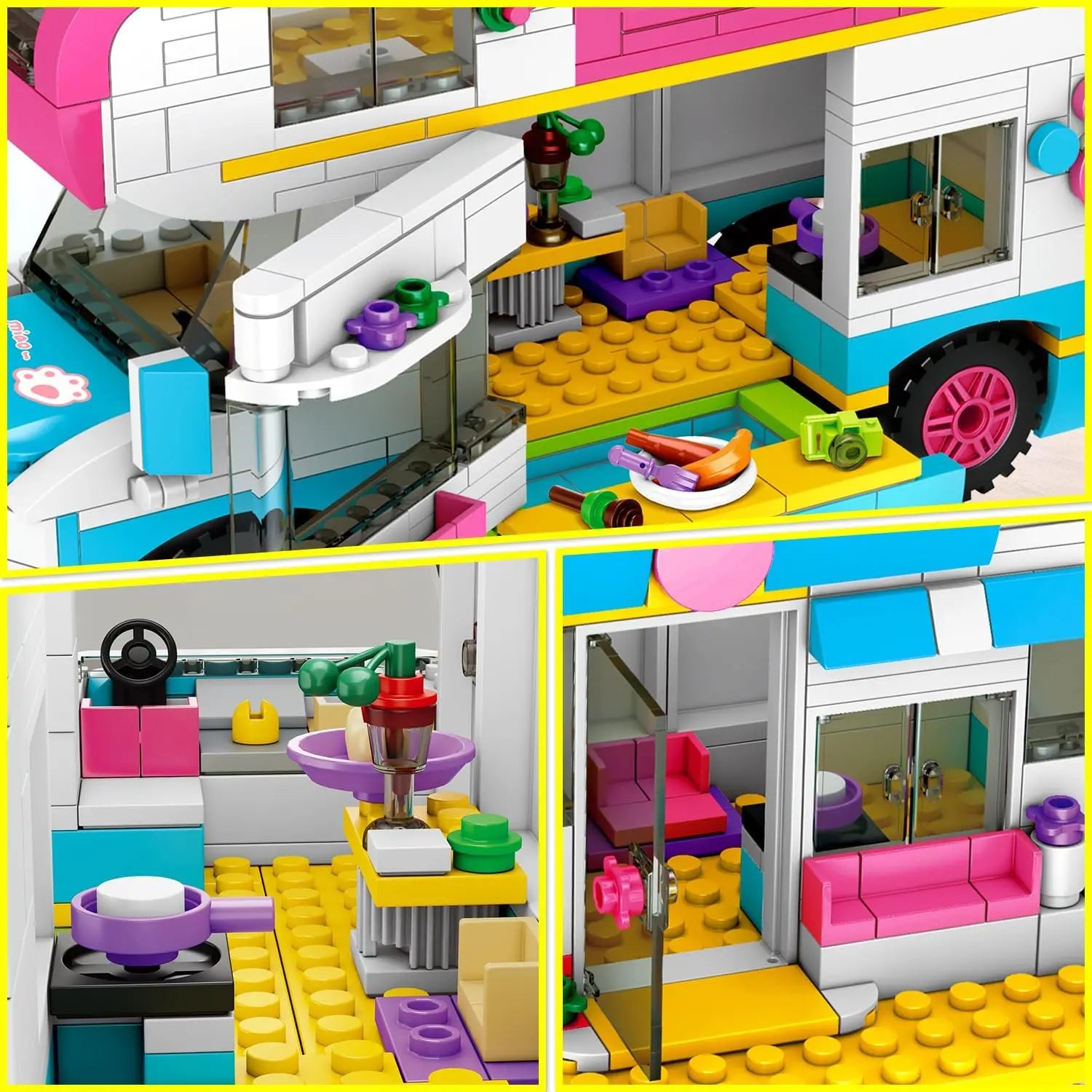【WONDERFUL DRIVING JOURNEY】- This girl's building kit comes with realistic props such as a barbecue grill, slide, swimming ring, outdoor viewing platform and more. Kids can build a friendship bus to get around the city, a camper van to enjoy the natural beauty of the countryside, or a seaside store and paddling in the pool. Let the kids use their endless imagination and embark on an amazing journey with this multi-functional building block playset!
