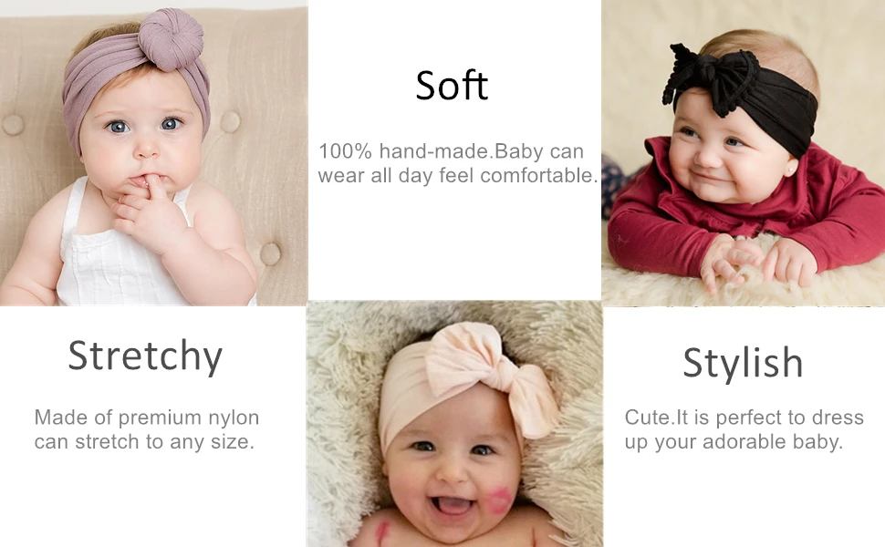 The baby turban headbands are made of nylon material.Super soft and stretchy headbands,they won't leave marks on baby's head. We offer 15 different Colors of super cute hair bows with elastic hairbands.Best gift choice for your baby or your friend who has a baby for baby shower, birthday party and family photo,Christmas,souvenir,holiday and etc.