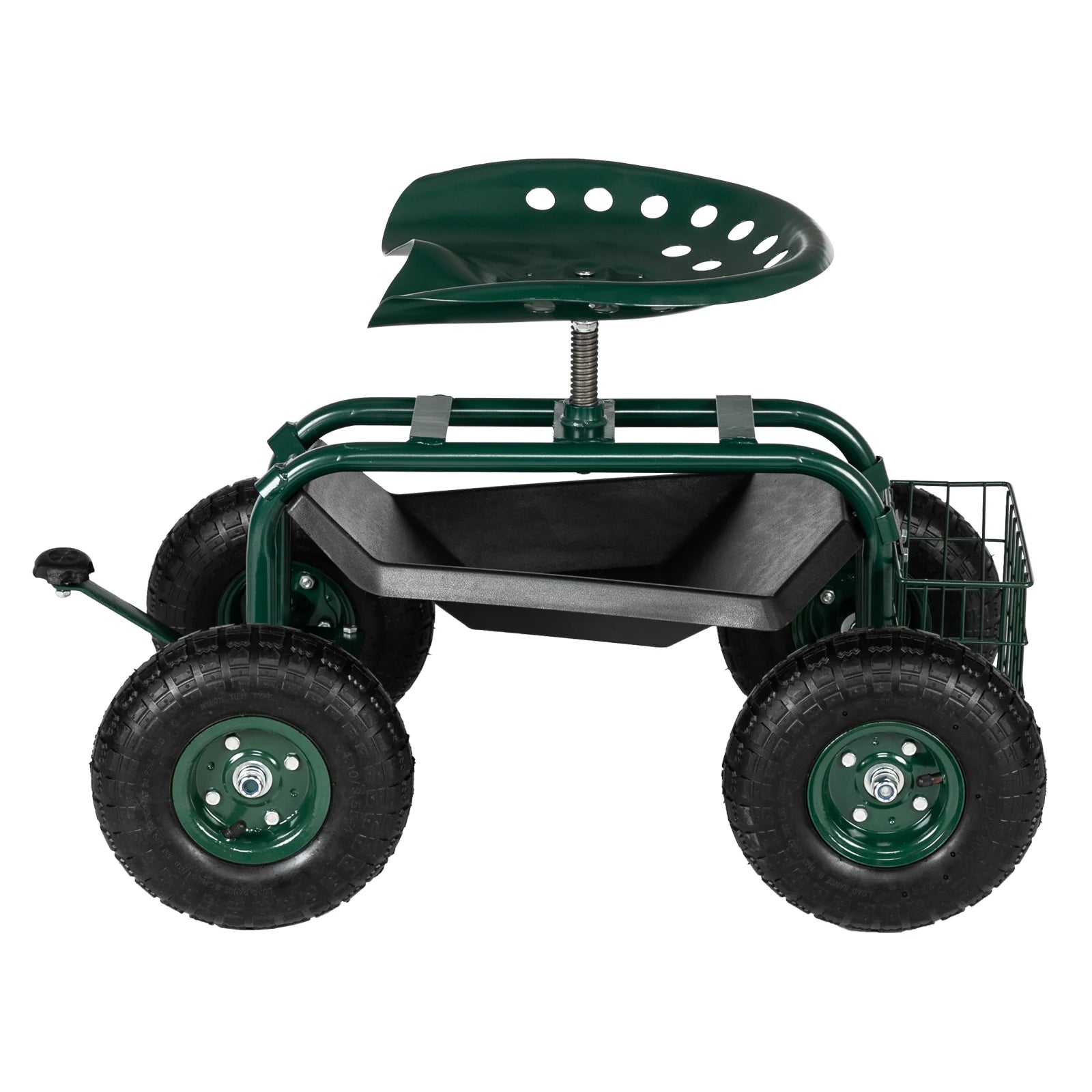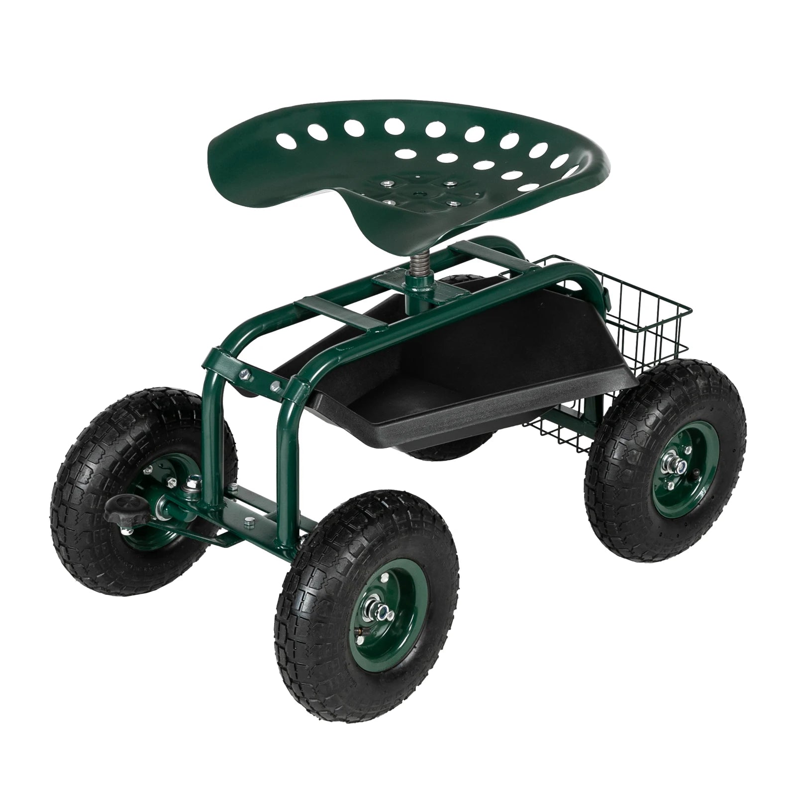 This garden carts with solid steel frame are both practical and modern, suitable for all kinds of gardens. This trolley is equipped with a large seat, which is ergonomic and comfortable. The height of the seat can be adjusted, and the seat can be rotated 360 degrees to meet your different needs. There is a grocery basket and tool tray under the seat, which provides convenience for you to garden conveniently and efficiently. 4 large pneumatic rubber tires with deep patterns can hold the ground safely to prevent tipping. With a steel rod with a handle, the trolley can be rotated in any direction.Features: