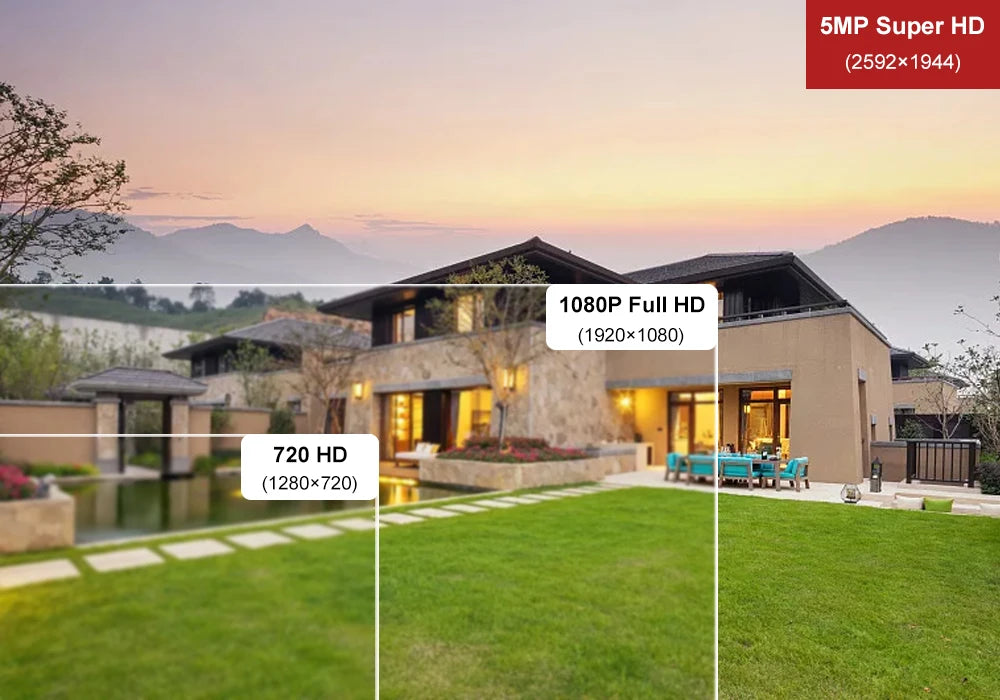 The 5MP 2592x1944 Resolution Show Higher-Quality Images,for both day and night vision,you can get exactly the details you need,much clearer than 1080p and 720p.