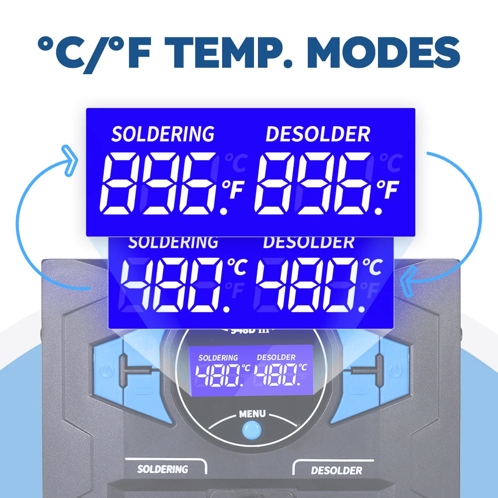 The soldering station features a rapid-heating 110W element for quick heat-up times. It offers adjustable temperature settings ranging from 200 to 480℃. Equipped with a built-in PID program, the station continuously monitors and adjusts for temperature loss every 20 milliseconds, ensuring swift temperature recovery. This versatile soldering iron station is suitable for various soldering applications, including larger solder joints.